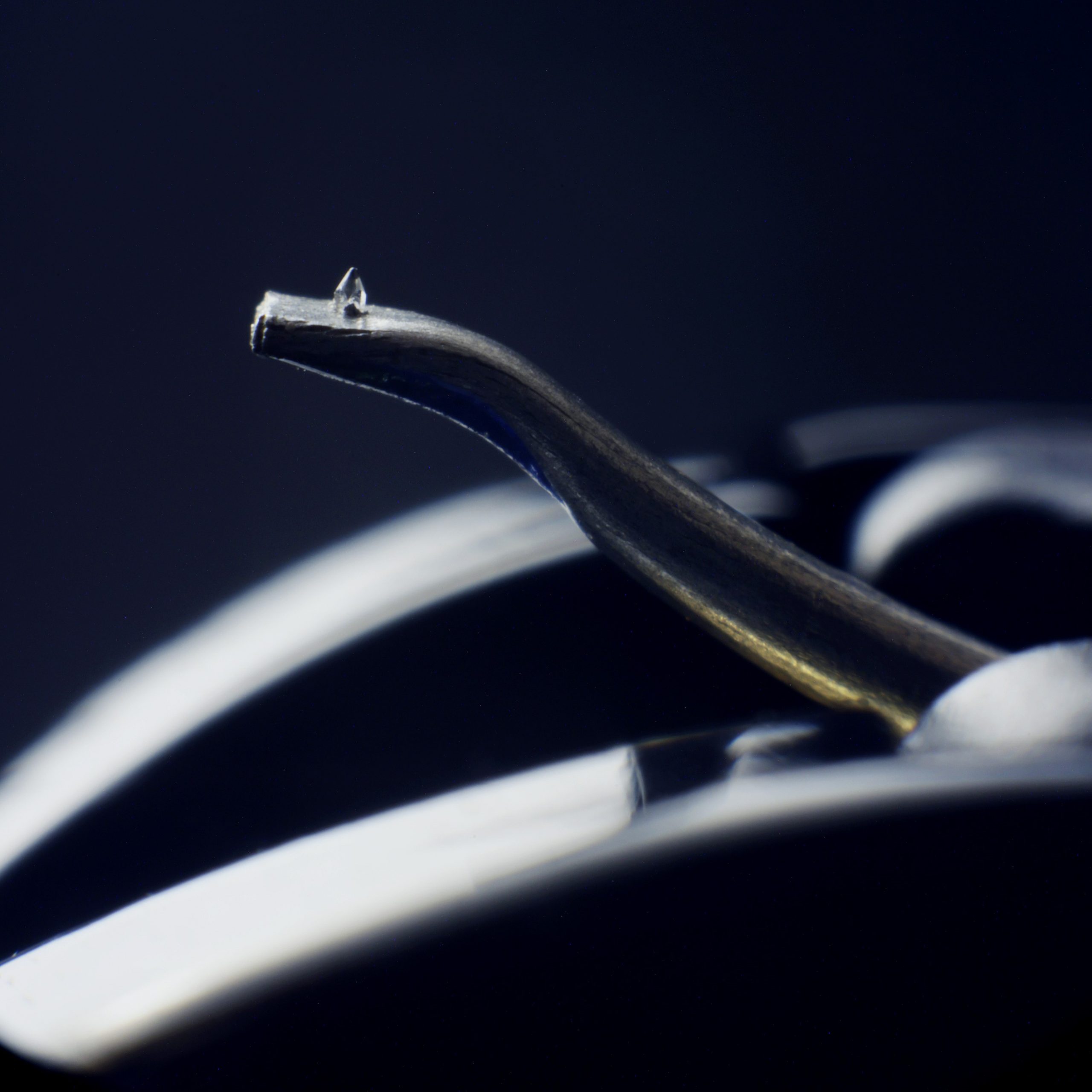 - Konischer S-Nadelträger (tapered S-cantilever) für reduzierte Effektivmasse an der Spitze.